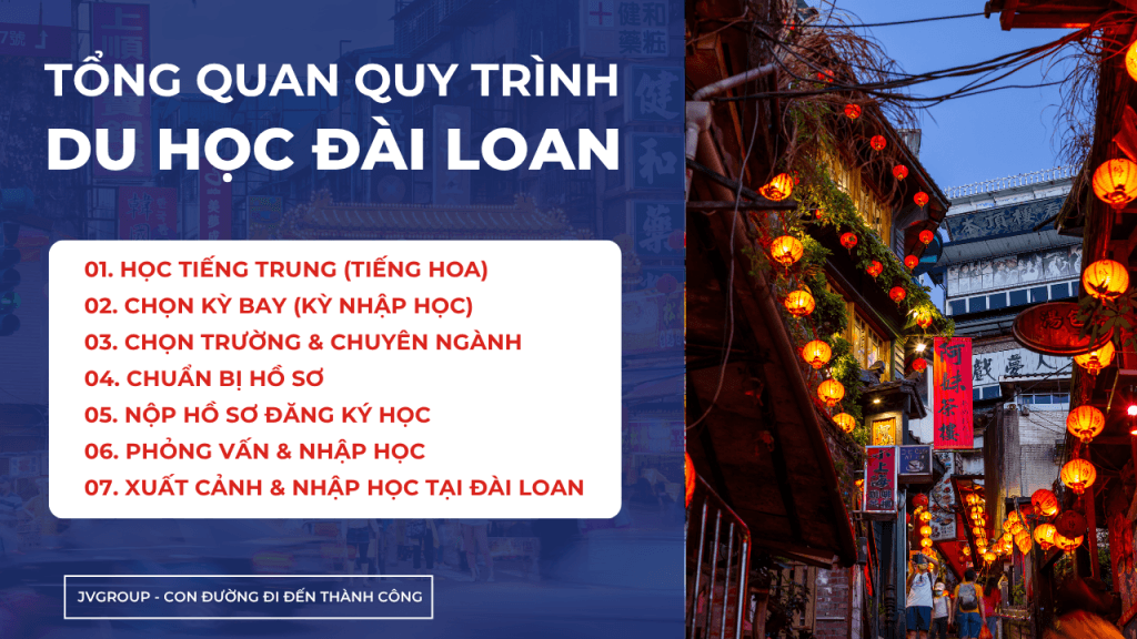 Sau khi hoàn tất hồ sơ, Trung tâm JVGroup sẽ mang hồ sơ của bạn đi dịch thuật công chứng, hợp pháp hóa lãnh sự tại Cục lãnh sự Bộ Ngoại Giao và xin tem xanh của Văn phòng VHKT Đài Bắc. Dựa vào nguyện vọng của bạn trung tâm sẽ hỗ trợ báo danh với trường.⏳ Thời gian xét hồ sơ thường từ 2 – 6 tuần tùy trường.